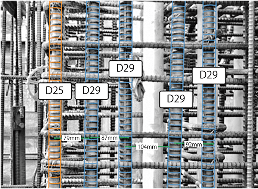 さらに、コンクリート工事で必須の配筋検査を、AIを利用した画像解析によって実施する技術が各社で開発されている。配筋検査は鉄筋径や本数、配置間隔や重ね継手長を確認する検査であり、人手と時間を要する検査であった。一方で写真だけで配筋を検査しようとすると、カメラと鉄筋との(焦点)距離や画角によって、写真からは正確な径や位置が上手く把握できなかった。この課題を3眼にしたカメラの開発や直交する検尺ロッドを基準にすることで、画像解析精度の向上を図り、これらの画像をさらにAIで解析する技術が開発されている。大林組では図-6のような配筋検査システムを開発し、推定正答率は94%で作業時間は36%短縮されたとしている9)。