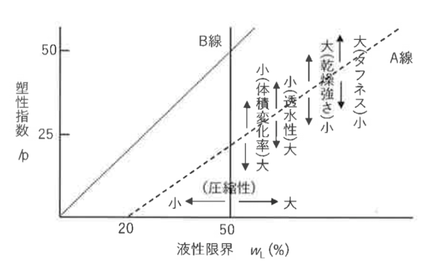 図-1では、横軸に液性限界、縦軸に塑性指数をとり、粘性土の特性が示されています。この図から、対象土の体積変化率、透水性、乾燥強度、タフネスなどの力学的性質の傾向を把握できます。ただし、施工の難易度についてはこの図からは判断できません。