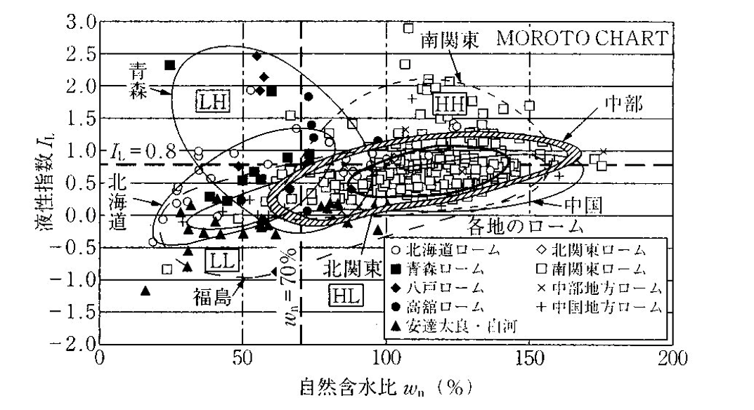 図-3は、全国各地で発生する火山灰質細粒土(粘性土)の自然含水比と液性指数を整理したもので、横軸に自然含水比、縦軸に液性指数を示しています。それぞれ大小の組み合わせからHH,HL,LH,LLの4つに分類しています。このうち施工上問題となるのは HH または LH 領域にあるものです。数は少ないものの、各地に存在することが確認されています。逆にHLやLLの領域にあるものはそれほど問題にならない土質です。この図から、自然含水比が高いからといって必ずしも施工性が悪いとは限らないことが分かります。
