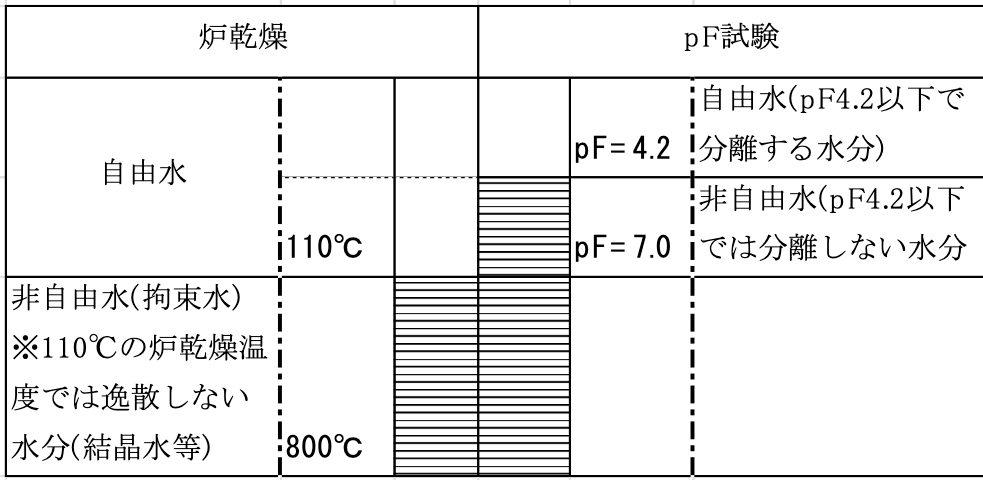 注意すべき点は、通常の炉乾燥法と pF 試験では自由水と非自由水の定義が異なることです。炉乾燥法の場合は110℃が逸散の境目ですが、一方土壌学の研究によれば、pF=4.2がその境界とされています。
