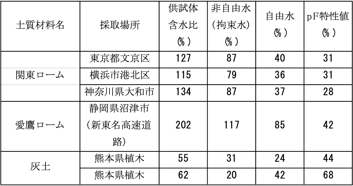 表-2では、関東ローム、静岡県に見られる愛鷹ローム、熊本県に見られる灰土について、pF=4.2に相当するエネルギーを与えた遠心分離試験の結果を示しています。表から得られたpF特性値は、灰土が44~68%、愛鷹ロームが42%、関東ロームが28~31%となっています。自然含水比に関しては灰土が55~62%であり、愛鷹ローム(202%),関東ローム(115~134%)に比べて低いため、一見すると施工性が優れているように見えます。しかし、灰土は自由水の割合が高いため、実際には施工性に課題があることが分かります。ここでも、自然含水比の大小だけでは施工性を判断できないことが明らかです。