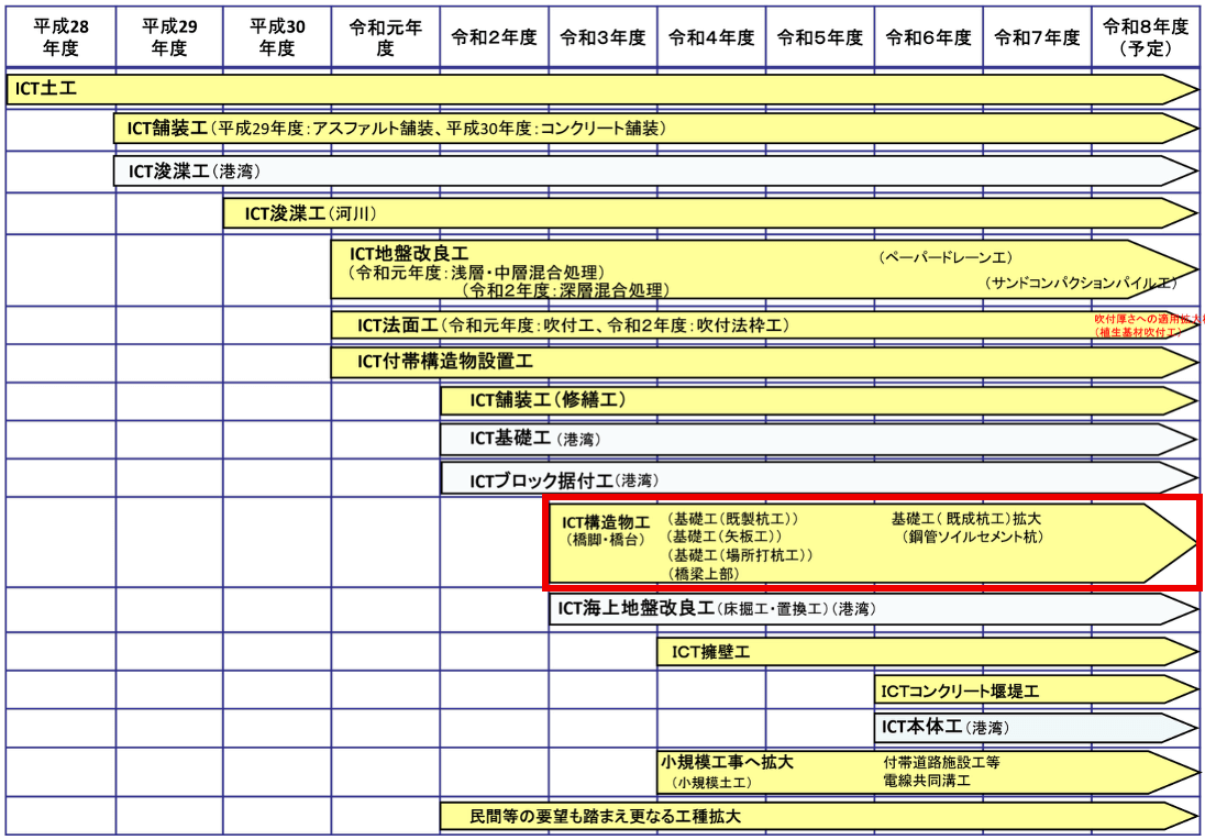 ICT活用工事は、平成28年度に土工を対象として始まり、その後、舗装工・浚渫工や地盤改良工・法面工等が対象となり、令和3年度以降、構造物工として橋台・橋脚、橋梁上部工とともに、基礎工にも適用工種が拡大されています(図−1)。