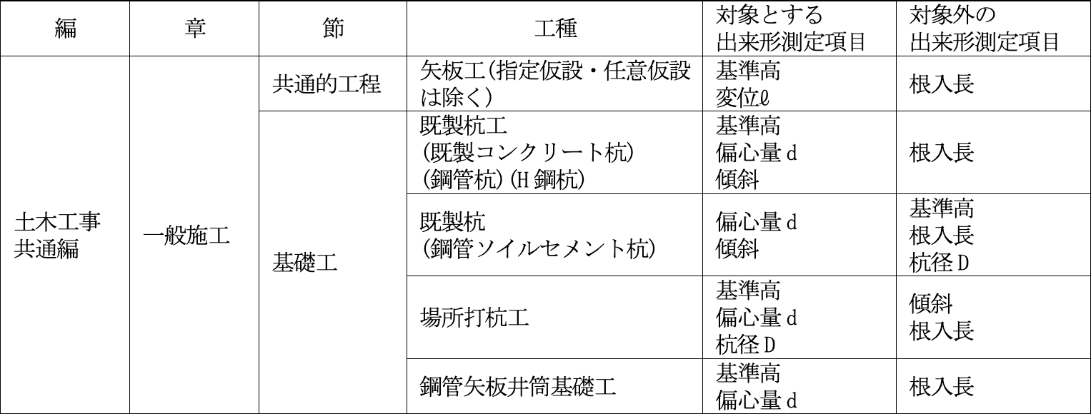 振動・打撃による工法は対象外ですが、杭工事のほぼ全ての工種が対象となっています。出来形管理項目としては、基準高、偏心量、変位、傾斜、杭径等が対象であり、根入長等は対象外となっています。出来形管理要領に示された適用工種区分のうち、土木工事共通編の例を表−1に示します。出来形管理要領には土木工事共通編の他、河川偏、河川海岸編、砂防編、道路編における基礎工の適用工事・適用範囲が示されています。
