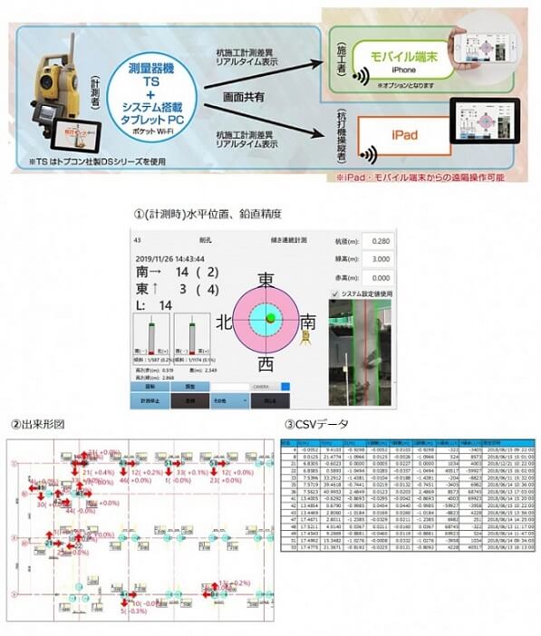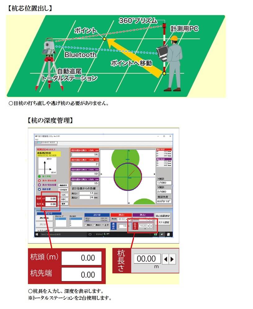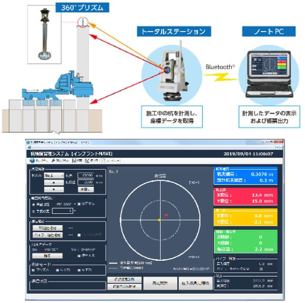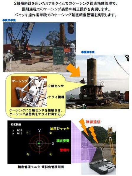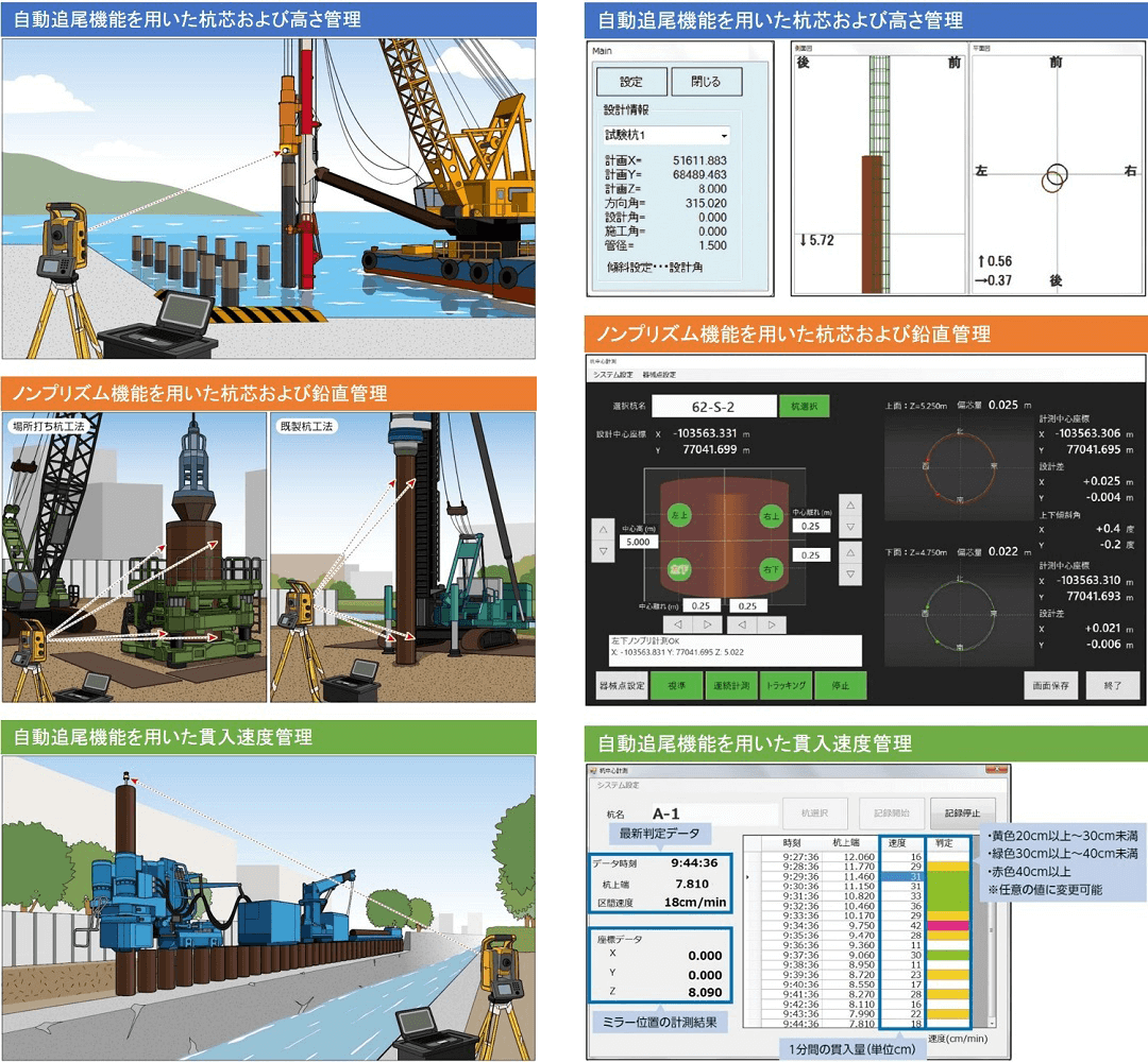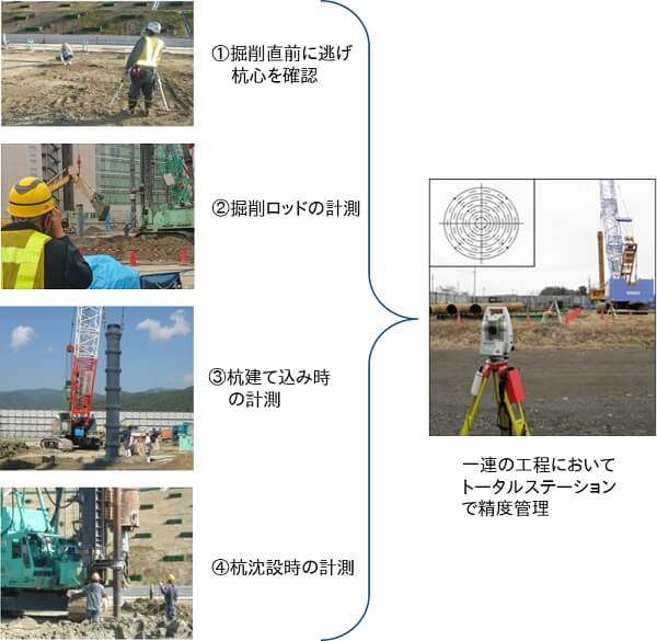 杭には多くの工法があり、それぞれの工法によって必要とされる管理項目が異なるため、各工法に特化したシステムが多いのが特徴です。詳細は前述の「杭の調査技術及び施工管理技術の体系化」を参照していただくこととして、今回のコラムでは、②杭芯位置・建込精度管理技術について説明したいと思います。