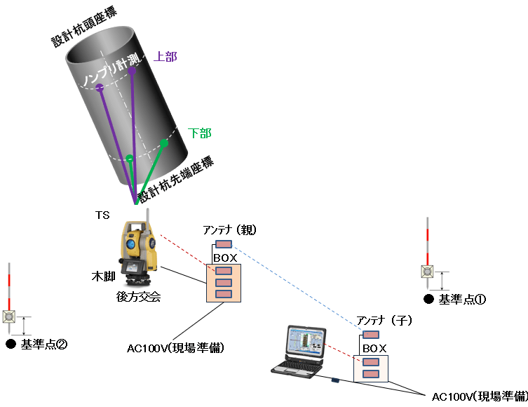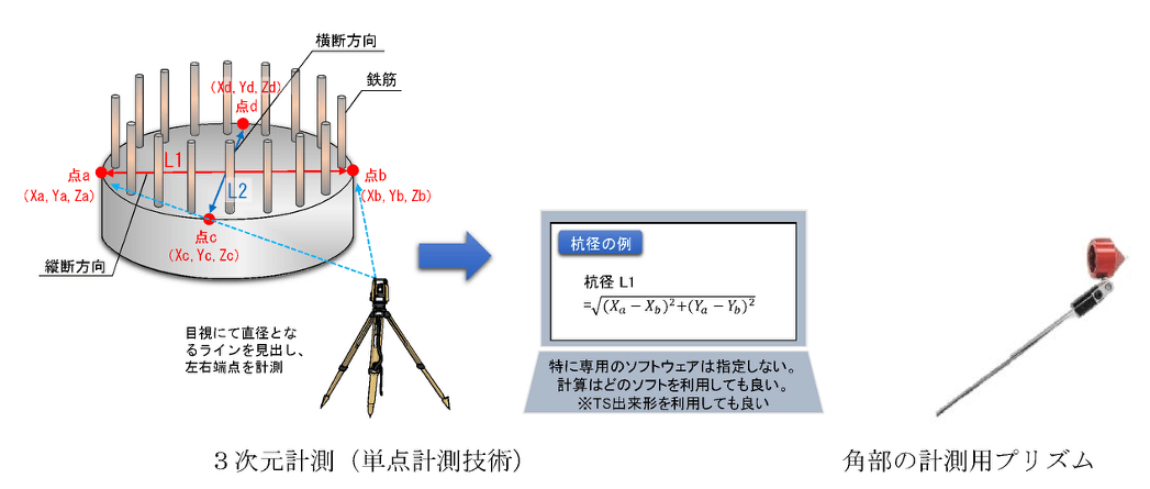 杭の出来形測定方法には、単点計測技術と多点計測技術があります。単点計測技術とは、TS(等光波方式、ノンプリズム方式)、RTK-GNSSのように、特定の1点のみの座標や角度、距離といった位置情報を3次元で計測する技術です。多点計測技術とは、空中写真測量(無人航空機)、レーザースキャナ(地上型、無人航空機搭載型、地上移動体搭載型)等があり、広範囲で連続的な3次元データ(点群データ)を計測する技術です。単点計測はピンポイントで高精度な計測が可能であり、多点計測は広範囲を面的に短時間で計測ができる、といった特徴があります。