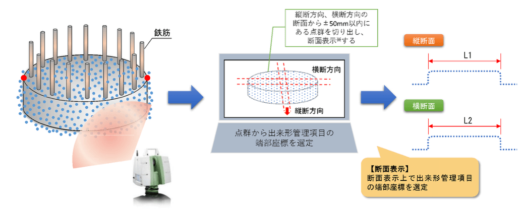 単点計測技術を用いる場合、杭の断面または測線上で計測項目の端部等の3次元座標を計測します。杭径は、測線を縦断方向とそれに直交する横断方向に設定し、それぞれの測線の端点における3次元座標から縦断方向の杭径(L1)、横断方向の杭径(L2)を算出します。基準高は杭天端面の中心付近で4点の標高を計測し、この平均値と設計標高との差を基準高とします。偏心量は杭径を計測した縦断方向、横断方向の測線の交点(x,y)をCAD等で算出し、設計杭芯に対する差から偏心量を求めます(図-2)。