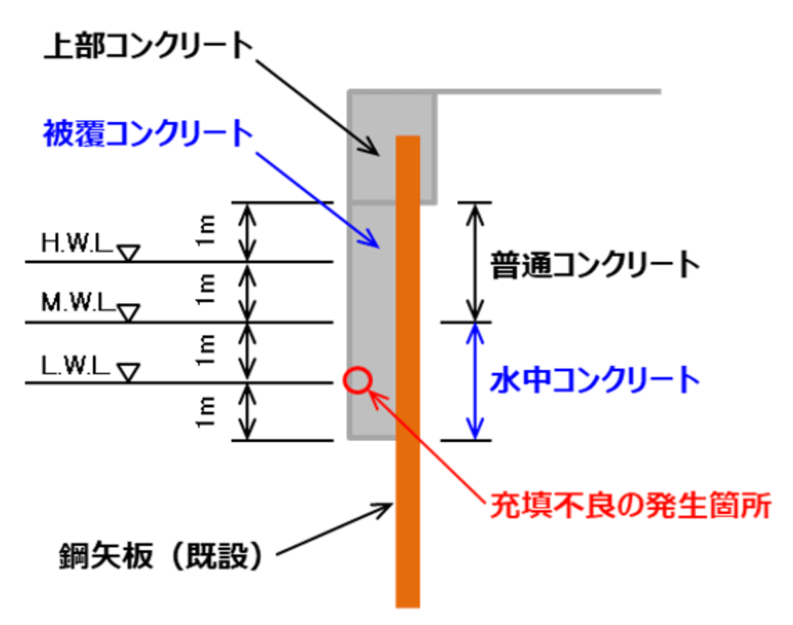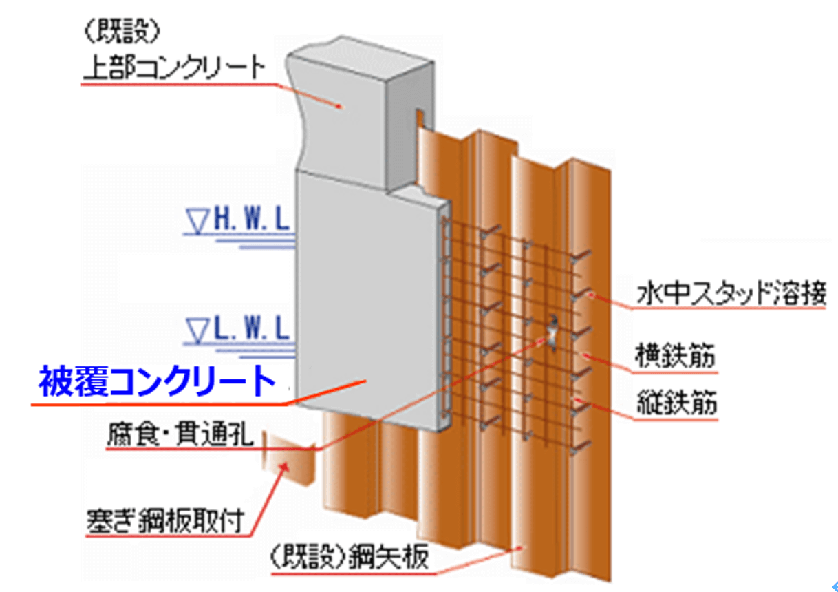 河口に近い河川護岸の改修工事において、既設の鋼矢板護岸の被覆コンクリート(厚さ300mm、高さ4m、延長12m)を施工した。被覆コンクリートのイメージを図-1に示す。水中部にある鋼矢板の一部に腐食(減肉)や貫通孔が確認されたため、鋼矢板の補強と防食を目的とした工事であった。被覆コンクリートは、干満帯(L.W.L.~H.W.L.)を含む高さ4mの範囲に施工した。