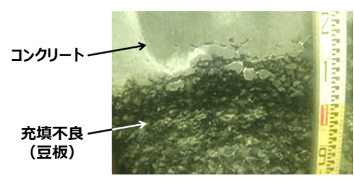 今回の施工では、既設の上部コンクリートの下部に被覆コンクリート用の型枠を設置するため、水中コンクリートの打込みにあたっては、あらかじめ型枠の一部を取り外しておき、そこから圧送ホースを斜めに型枠内に挿入して施工した。よって、配筋状況などによっては、圧送ホースが鉄筋と干渉して型枠の下部まで挿入することが難しくなるような状況も想定された。打込み作業員へのヒアリングにおいても、下層のコンクリートに圧送ホースを挿入するように指示はされていたものの、それが確実に実施されていたかどうかについては十分に管理されていなかったことが分かった。