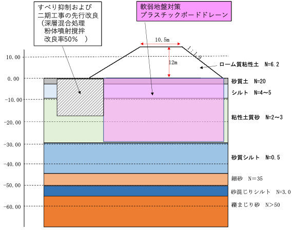 一期工事は、盛土高は12mで、現地発生土であるローム質粘土で築造され、のり勾配は1:1.9であった。軟弱地盤対策として、盛土直下に沈下対策としてプラスチックボードドレーンを用いた圧密促進工法が採用されていた。また将来の拡幅計画に備え、拡幅側の盛土のり尻付近には、一期盛土のすべり抑制と二期工事の先行改良の目的で、深さ18m付近まで、深層混合処理工法による地盤改良を行っていた。粉体噴射撹拌工法による格子状改良で改良率は50%であった。