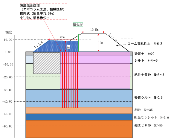 二期工事は、一期工事の終了からおよそ8年後に着手された(図2)。二期工事にあたっては、当該盛土は橋梁に隣接していたことから、橋梁方向(縦断方向)への二期盛土の側方流動を防ぐために追加の地盤改良補強を行う必要があった。そこで、まず追加の地盤改良の施工ステージとするために高さ8m程度まで盛土を築造し、その上を作業スペースとして地盤改良を行った。追加の地盤改良はスラリー式機械撹拌工法のエポコラム工法を採用した。機械撹拌による接円配置として、改良率は約80%とした。なお、この際に地盤改良施工に先行して供用中の路面への影響を防ぐために、のり肩部に長さ12mの縁切り矢板を盛土底部まで打設した。