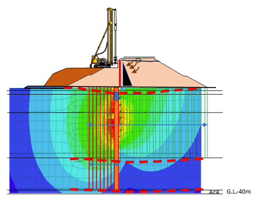 今回の事例では、供用中の道路への影響を遮断するための縁切りとして矢板が打設されているが、一期盛土下の地盤は対策済みという認識であったことから、矢板は盛土底部までしか入れられていない。今回の事例では変形発生後の追加対策として深さ30m程度まで鋼矢板を打設して二期地盤改良を実施し、盛土の築造工事を行うこととした。軟弱地盤は深さ50m程度まで続いていることから、一般的な鋼矢板打設の可能深度を上回っており、完全な縁切りは難しいものの相当の効果があると推定される。