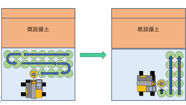 また、一期工事の時点で二期区間に先行の対策を行っておらず、二期工事で追加の対策が必要な場合、追加の地盤改良に用いる重機を小型にして地盤への負荷を小さくする、既設盛土からある程度の離隔をとって影響を抑える(図4)などの工夫が必要である。また今回の事例では、改良柱体を打設する順番が盛土縦断方向に並行して打設(図5左)されていたことがわかっている。このようなやり方では、盛土横断面で考えると、法尻に改良柱体を打設されて、影響を受けている盛土の面積に対して、打設されている改良面積が比較的小さくなる。図5右のように、改良柱体の打設順序を盛土縦断に直交する方向にして、追加工事の影響を受ける一期盛土の範囲に対して、打設済み柱体による抵抗領域ができるだけ大きくなるよう施工するといった工夫も考えられる。