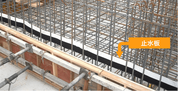 止水板の設置位置については、事前に打継面中央となる位置を明示し、固定用鉄筋や専用の固定治具を用いて確実に保持する。打設中に止水板へ振動機が直接接触しないよう施工管理を行い、コンクリート打設後に位置のずれが生じていないか確認する。