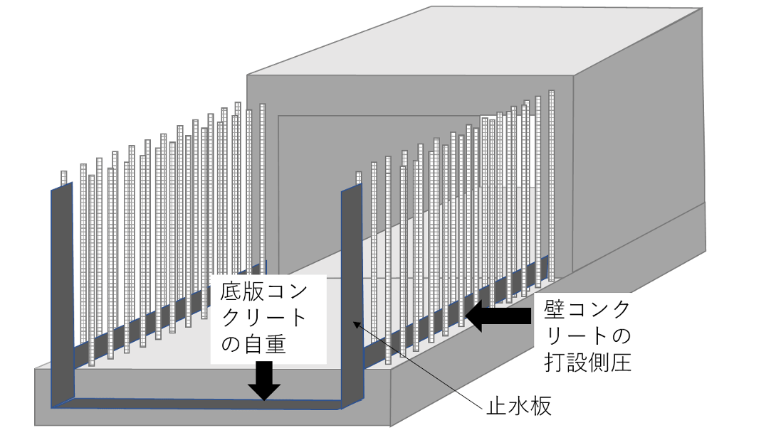 写真-3のような配置の止水板に対して、壁コンクリートを打設する際、フレッシュコンクリートの側圧が止水板の片側のみに、例えば図-1のように作用することで、止水板が底版側へ倒れ込むように変形し止水機能が低下する。同様に、図-1のように底版の鉛直打継面に水平に止水板が設置される場合、止水板上面のコンクリートの自重やその上を作業者が踏んだりすることで止水板が折れ曲がり止水機能が低下する。特にゴム系止水板は曲げ剛性が小さいため、片側からの力の作用で曲がりやすい。