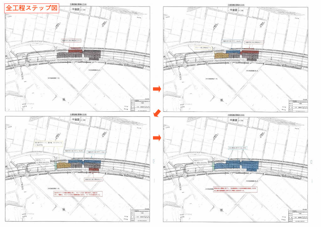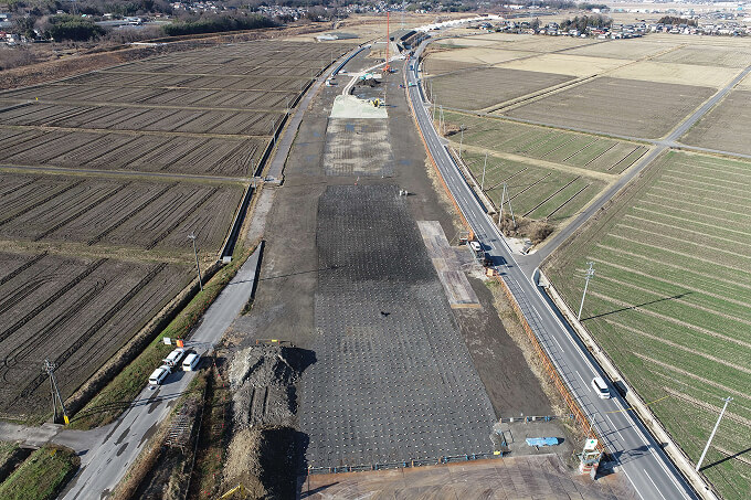 当初計画では、地盤改良工事として「バーチカルドレーン工法」と「固結工(CI-CMC工法)」で行う予定でした。しかし、隣接するエリアで別発注のボックスカルバートの埋設工事があり、発注者からその工事をなるべく早く着工したいとの要望があり、施工計画を再検討することにしました。そこで、ボックスカルバートの施工に必要となるヤードを先に引き渡すため、当該箇所のドレーン工の一部を先行して実施し、早期に引き渡せるように、固結工、ドレーン工の2工種同時施工で対応することとしました。2工種同時施工を実施し、施工日数の短縮を図ることができたことで、次工事のボックスカルバートの施工に早期に引き渡しを行うことができました。また、これに伴い、ドレーン工の施工で必要となる排水層の施工が必要になったため、新たに「サンドマット工」が追加となり、さらに工期の初期段階で、地中に農水管の残置が確認されたため、そちらの撤去及び移設作業も追加で行いました。
