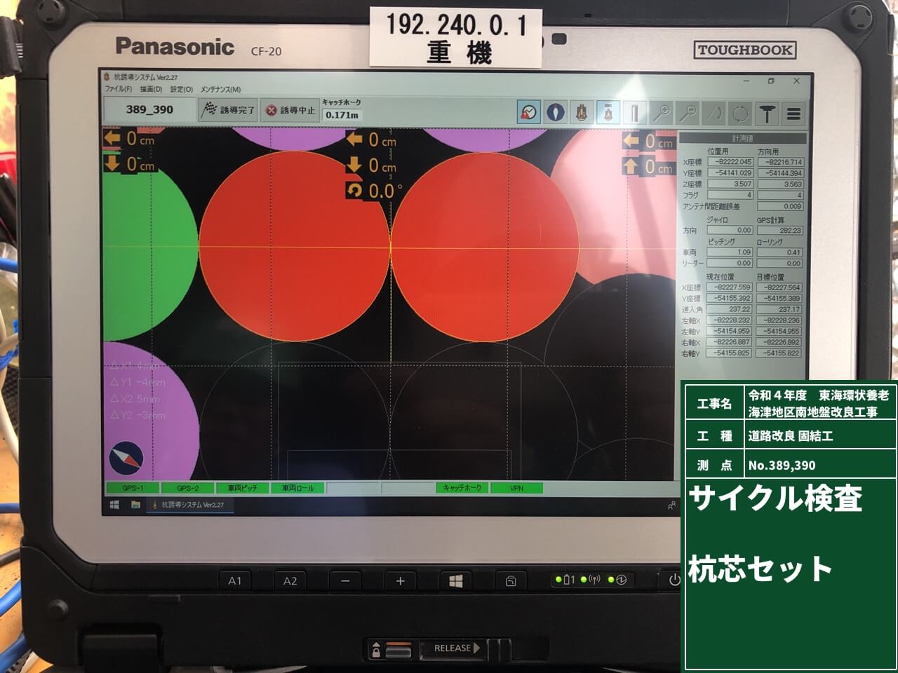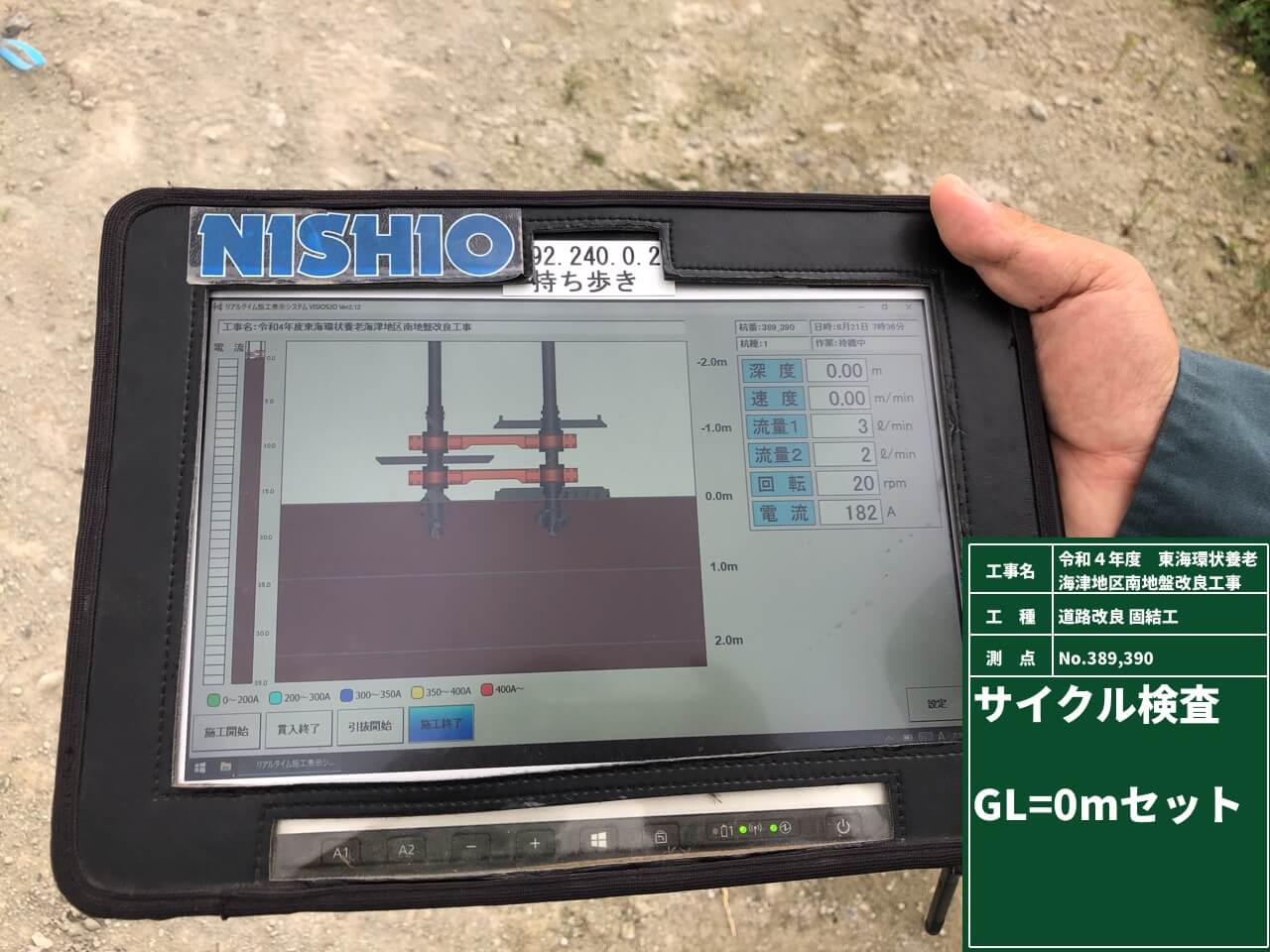施工計画全体を見直して2工種同時施工にしたことが、工期短縮を可能にした一番の要因だと思います。また、深層混合処理を行うCI-CMC工法において、GNSS杭芯誘導システムを活用し、杭芯の位置をモニター確認することで、正確かつスピーディな杭打ちを行うことができました。当該現場では1000本以上の杭打ちを行いましたので、この作業だけで相当な工期短縮ができたと思います。杭のセット完了時も「Vizios3D」機能を活用してタブレット端末で深度計0mを確認することができましたので、次の施工にもスムーズに移行することができました。