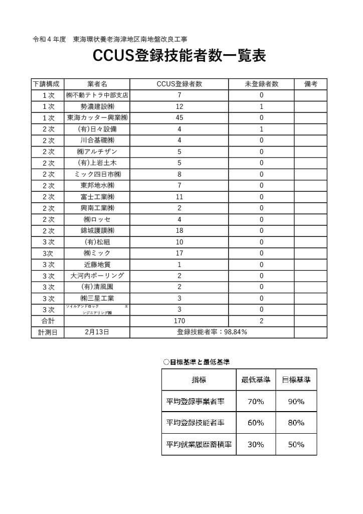 CCUS(建設キャリアアップシステム)活用モデル工事は、設定された基準を達成することで工事成績評定の「創意工夫」の「その他」において加点されますが、一方で、以下のような厳しい目標基準が定められており、概ね3か月に一回の頻度でチェックを行い、その平均値を提出しなければなりません。